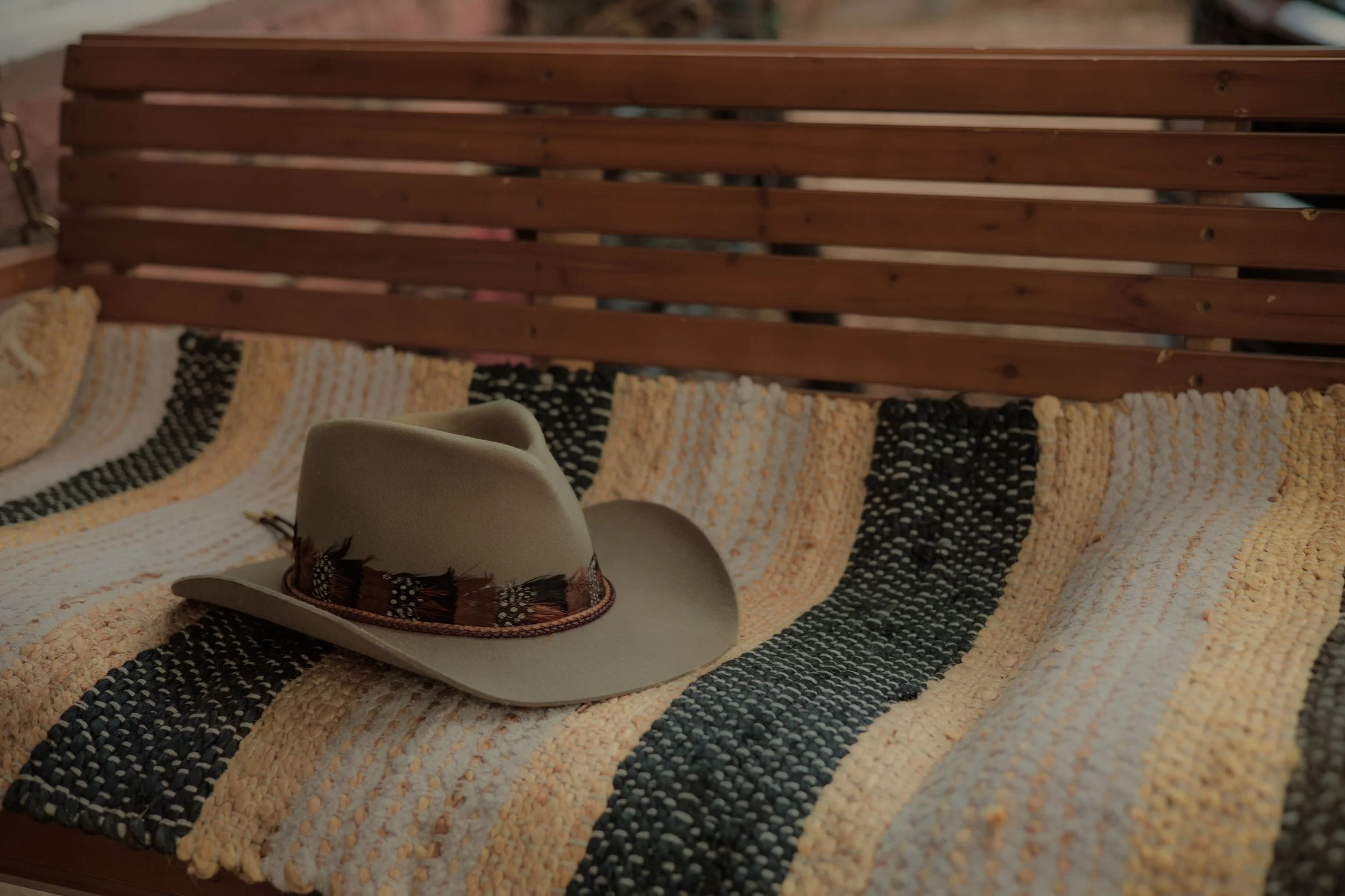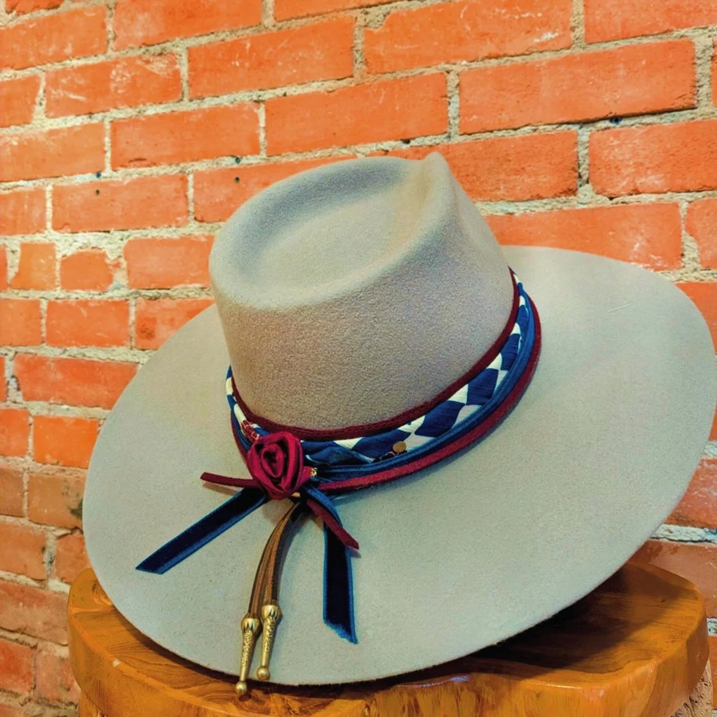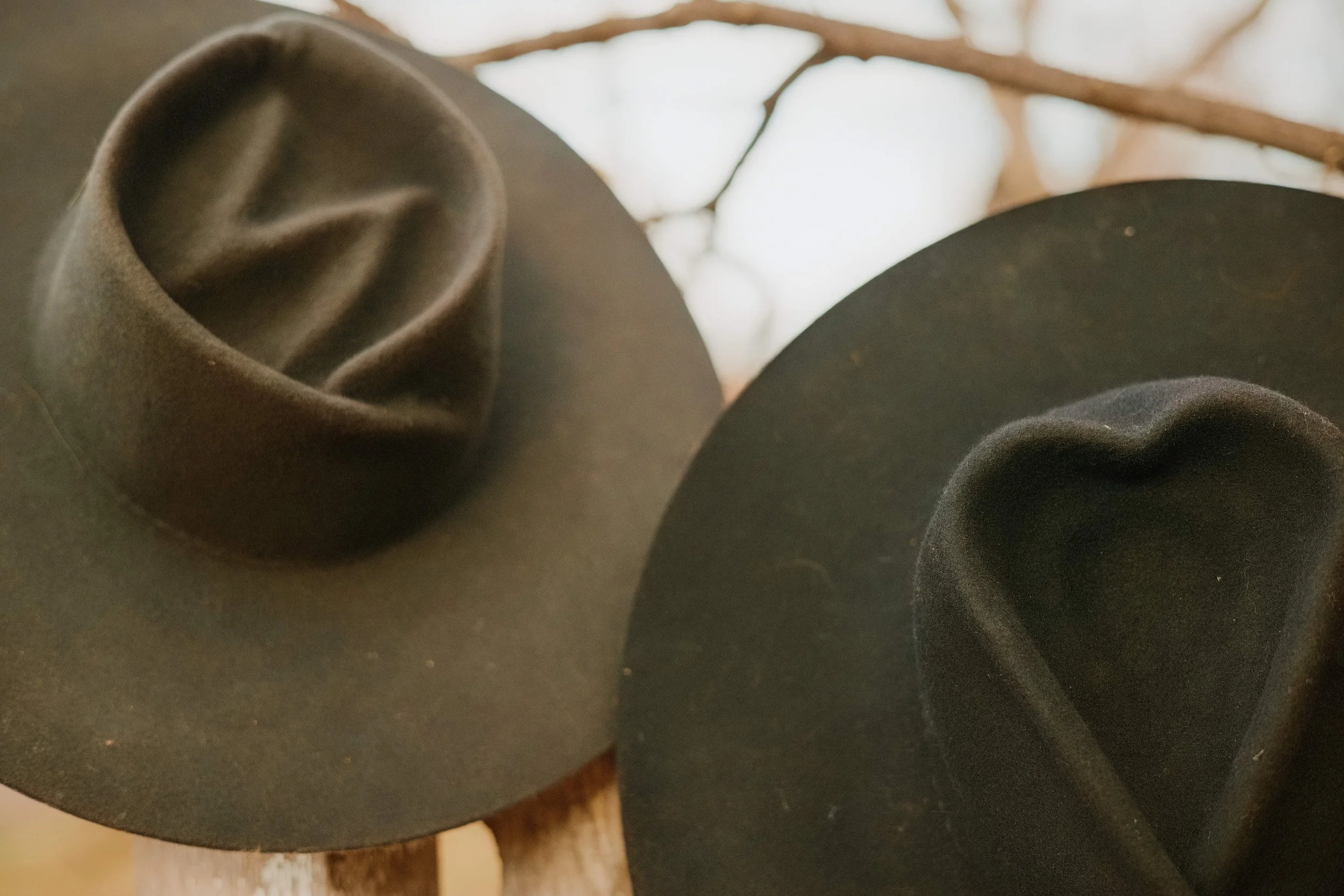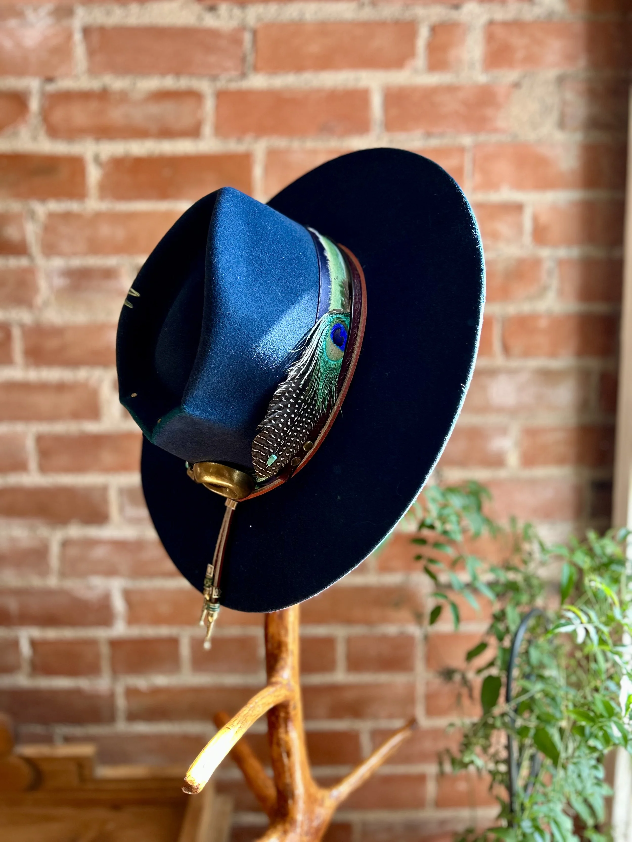 The design comes to life through the details. Hat bands, stitching, pins, rivets, branded elements, and bespoke accents are layered with care to bring depth, texture, individuality, and expression to the piece. Many hats are also completed with a meaningful heirloom or personal memento — a cherished pin, vintage button, small trinket, or other keepsake woven into the design.06. the finish
